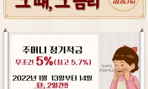 | 주머니정기적금 그때 금리 12개월 5.7% 고금리 적금 1월 13일 9시 판매 시작 (1) | 2022.01.13 |