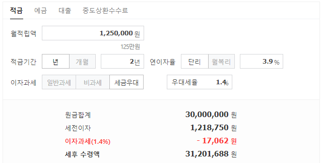 월 125만원씩 2년동안 불입하고 연 3.9% 금리에 세금우대/저율과세로 가입할 경우 만기이자는 1,201,688원을 받을 수 있습니다.