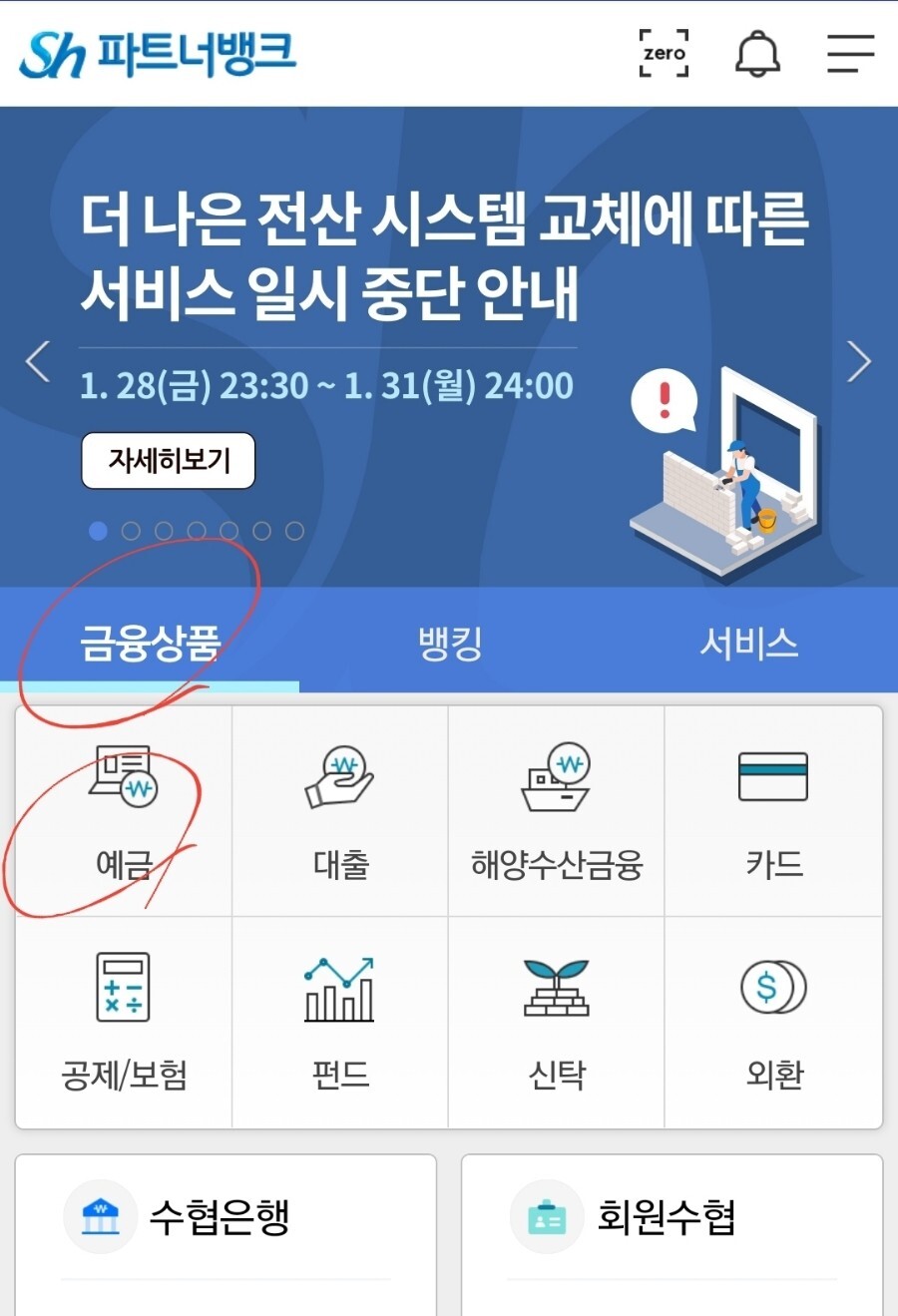 Sh파트너뱅크 비대면 정기적금 개설전에 반드시 경기남부수협 지점들중 하나의 지점의 입출금통장을 먼저 개설해야 합니다.