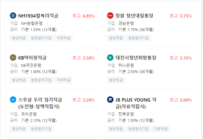 현재 판매중인 청년적금을 확인해보면 은행별로 적금 금리가 조금씩 다르다는 것을 알 수 있습니다.