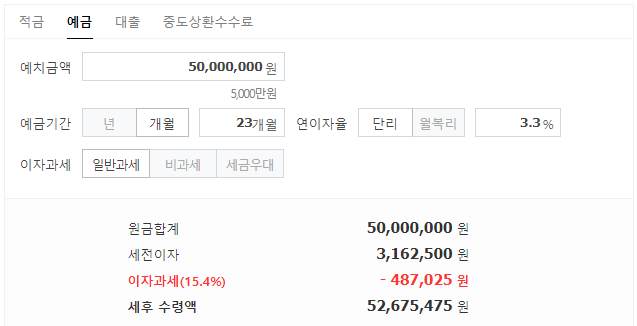 국일신협 유니온자유적립 적금을 첫달에 5,000만원을 납입하고 23개월 만기까지 유지하고 연 3.3% 금리에 세금우대/저율과세(1.4%) 혜택까지 받을 수 있다면 만기이자는 2,675,475원을 받을 수 있습니다.