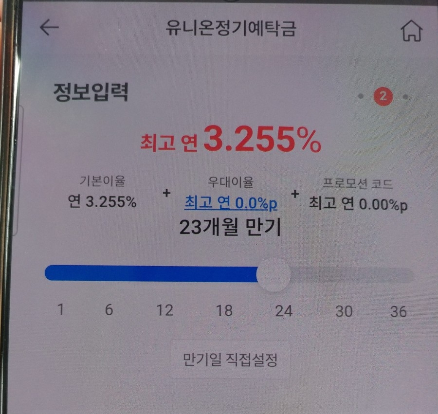 유니온정기예탁금 화면에서 가입 개월수에 따른 금리를 확인할 수 있습니다.