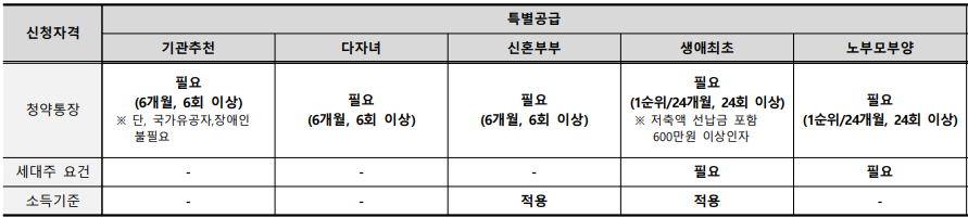 특별공급의 경우 청약 통장이 필요 없거나 통장 가입 횟수가 기간이 모두 다르기때문에 각 특별공급마다 청약조건을 꼭 확인해보시고 조건에 해당되는지 확인해보셔야 합니다.