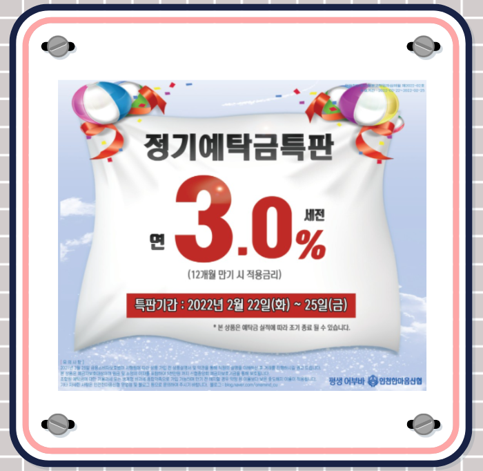 | 등촌신협 특판정기예금 12개월 3.1% 신협온뱅크앱으로 비대면 가입 가능합니다 (0) | 2022.02.19 |