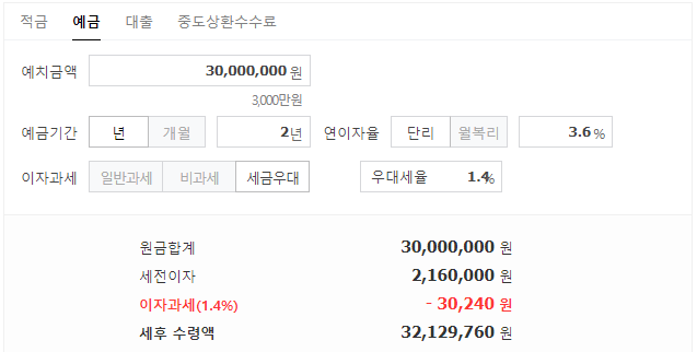 3천만원을 24개월동안 예치하고 연 3.6% 금리에 저율과세(1.4%) 금리를 적용 받을 수 있다면 만기이자는 2,129,760원을 받을 수 있습니다.
