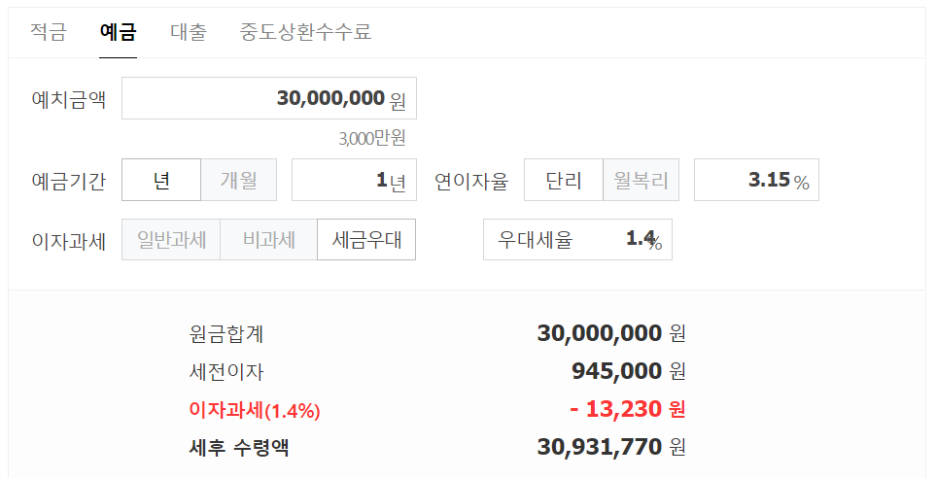 3,000만원을 12개월 동안 예치하고 연 3.15% 금리에 세금우대/저율과세(1.4%) 혜택을 받을 수 있다면 만기이자 931,770원을 받을 수 있습니다.
