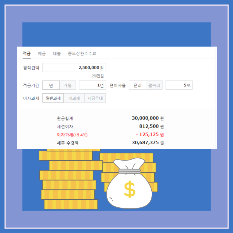 월 250만원씩 12개월동안 불입하고 연 5.0% 금리에 일반과세 15.4%로 가입한다면 만기이자는 687,375원을 받을 수 있습니다.