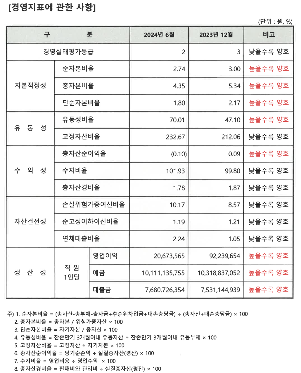 마산수협 2024년 상반기 경영공시를 살펴보면 2023년보다 등급도 올라가고 전반적으로 경영지표가 좋아지고 있는 것으로 보여지네요